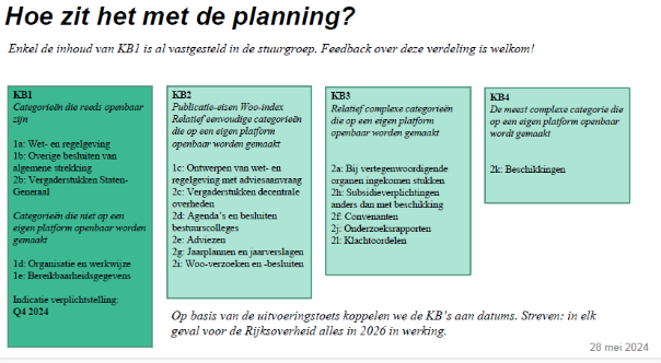 Dat wij in 2026 de informatiecategorieën van KB3 actief gaan publiceren op het aangeschafte gemeentelijk Woo-publicatieplatform. Datum Koninklijk Besluit is bij moment van schrijven nog niet bekend.